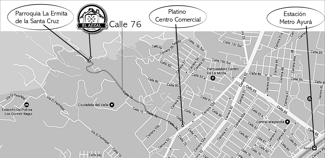 b) METRO: Abajo de la estación del metro Itagüí puedes tomar un bus azul con blanco de la Empresa Taxiger que en sus letreros diga El Ajizal. Bajate en la Parroquia La Ermita de la Santa Cruz y sigue los pasos 3, 4 y 5 del primer apartado de esta página.